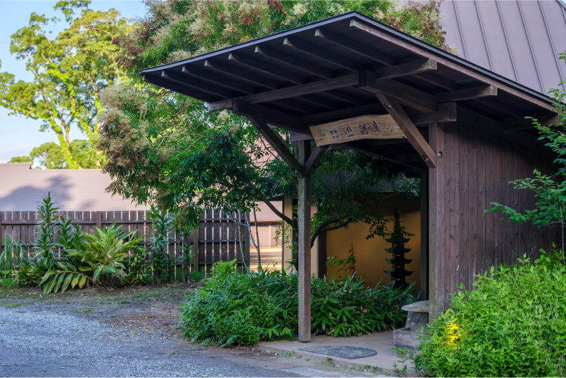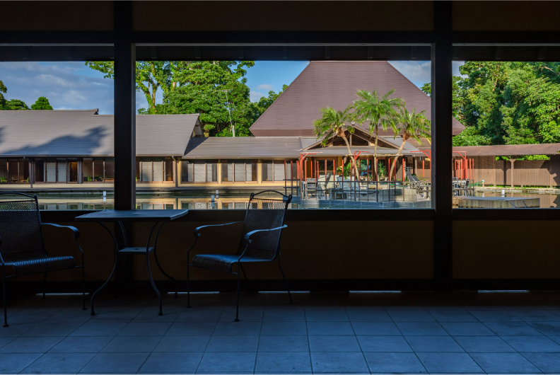 アプローチから続く母屋は寛ぎの空間。木のぬくもりを感じる内装と、あふれる開放感でお客さまをもてなします。池を臨むロビーでチェックインまでのひとときをお過ごしください。