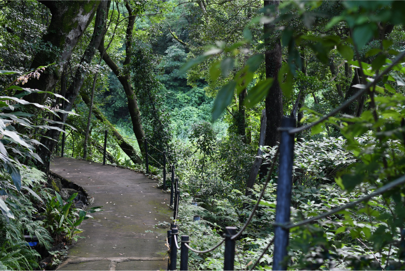 お部屋までの移動は専用のカートで送迎いたします。木々の緑と、陽の光。眼下に広がる指宿の街と錦江湾。お部屋までの道のりもリゾート感覚を味わえます。