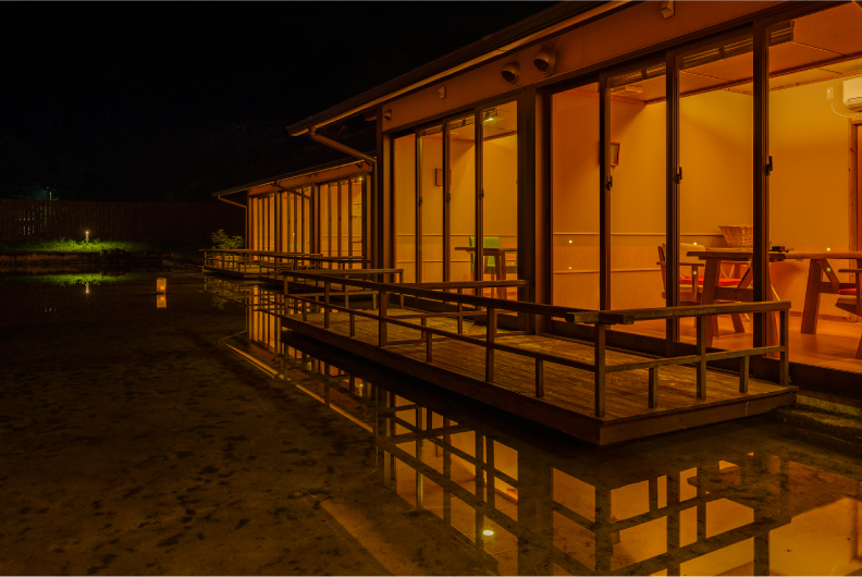 山道を抜けて現れる離れ宿。アプローチへ足を踏み入れると、静かに水を湛える池が出迎えます。池を囲うように続くアプローチは、日常のざわめきから非日常的な空間へお客さまを誘います。