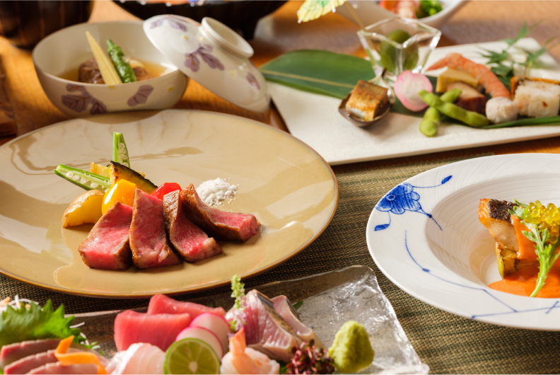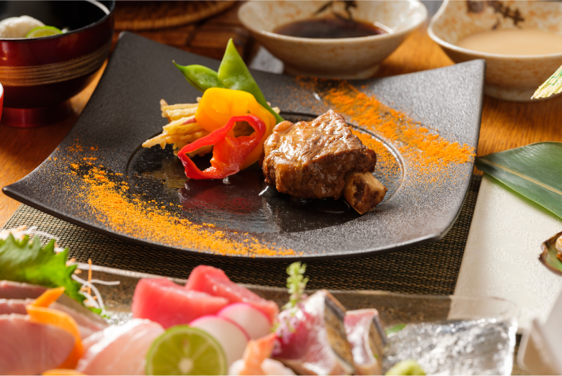 四季折々、旬の地元素材を活かした多彩なメニューをご用意しています。目にも鮮やかなお料理の数々は、特別な時間に華を添えます。落ち着いた雰囲気漂う個室で、ごゆっくりとお寛ぎください。